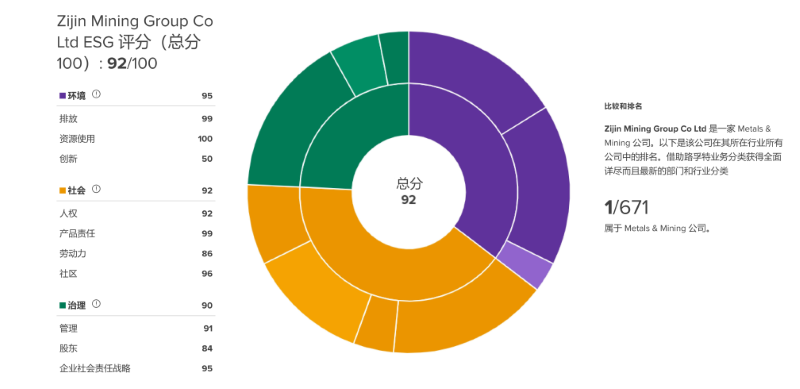 近日,全球主要评级世界杯网上购买平台(China)官方网站之一“路孚特ESG”更新了紫金矿业的最新ESG评分,紫金矿业分数进一步提升至92分,位列全球671家金属与采矿行业世界杯网上购买平台(China)官方网站第一名。