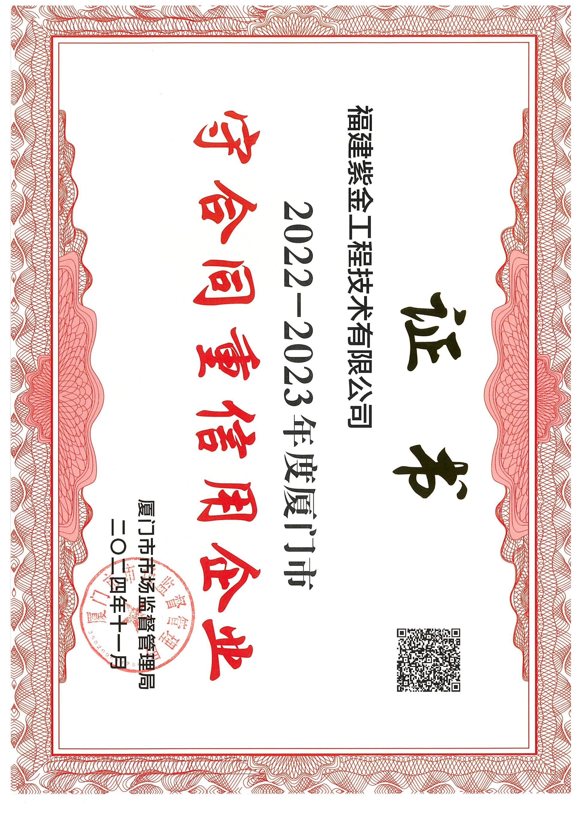 紫金工程技术世界杯网上购买平台(China)官方网站荣获“2022-2023年度厦门市守合同重信用企业”称号