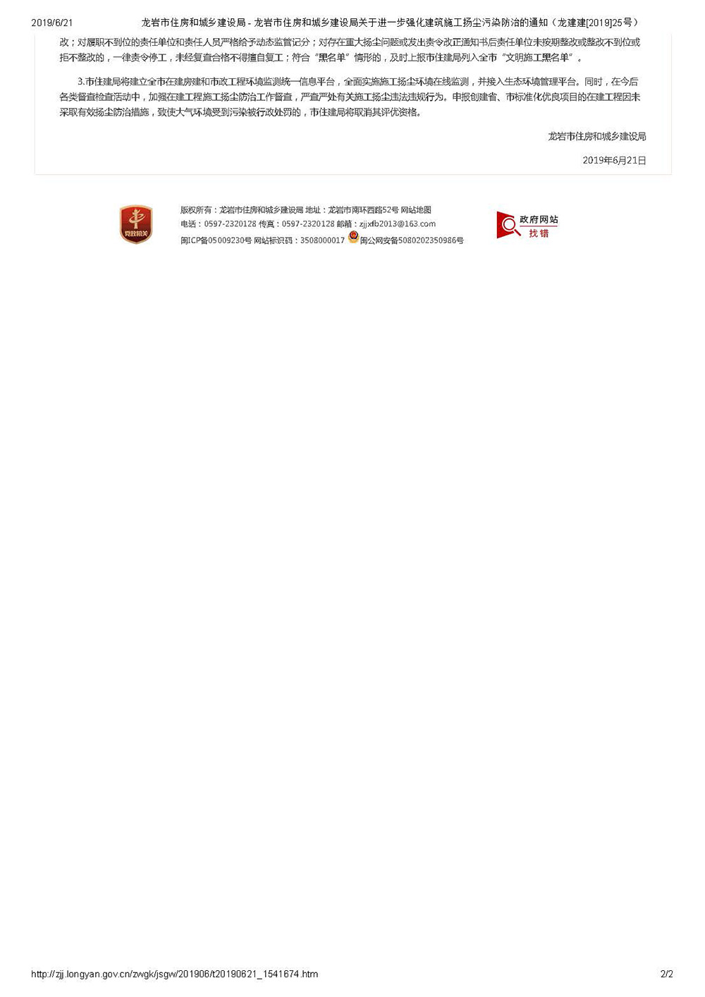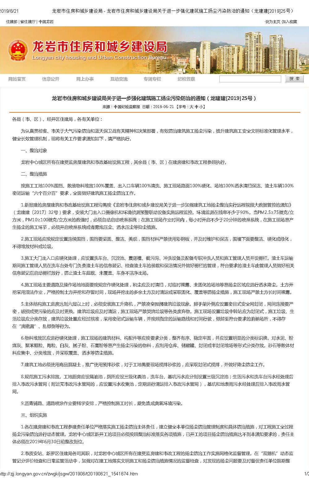龙岩市住房和城乡建设局关于进一步强化建筑施工扬尘污染防治的通知(龙建建[2019]25号)
