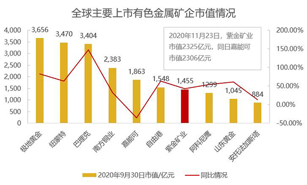 日前,全球28家上市有色金属矿业企业陆续发布2020年1-3季度业绩报告。观察显示,紫金矿业各项经济指标赶超速度正在加快,特别是今年11月以来,紫金矿业市值进入2000亿元方阵,高位时超过2300亿元,已比肩嘉能可同期市值。