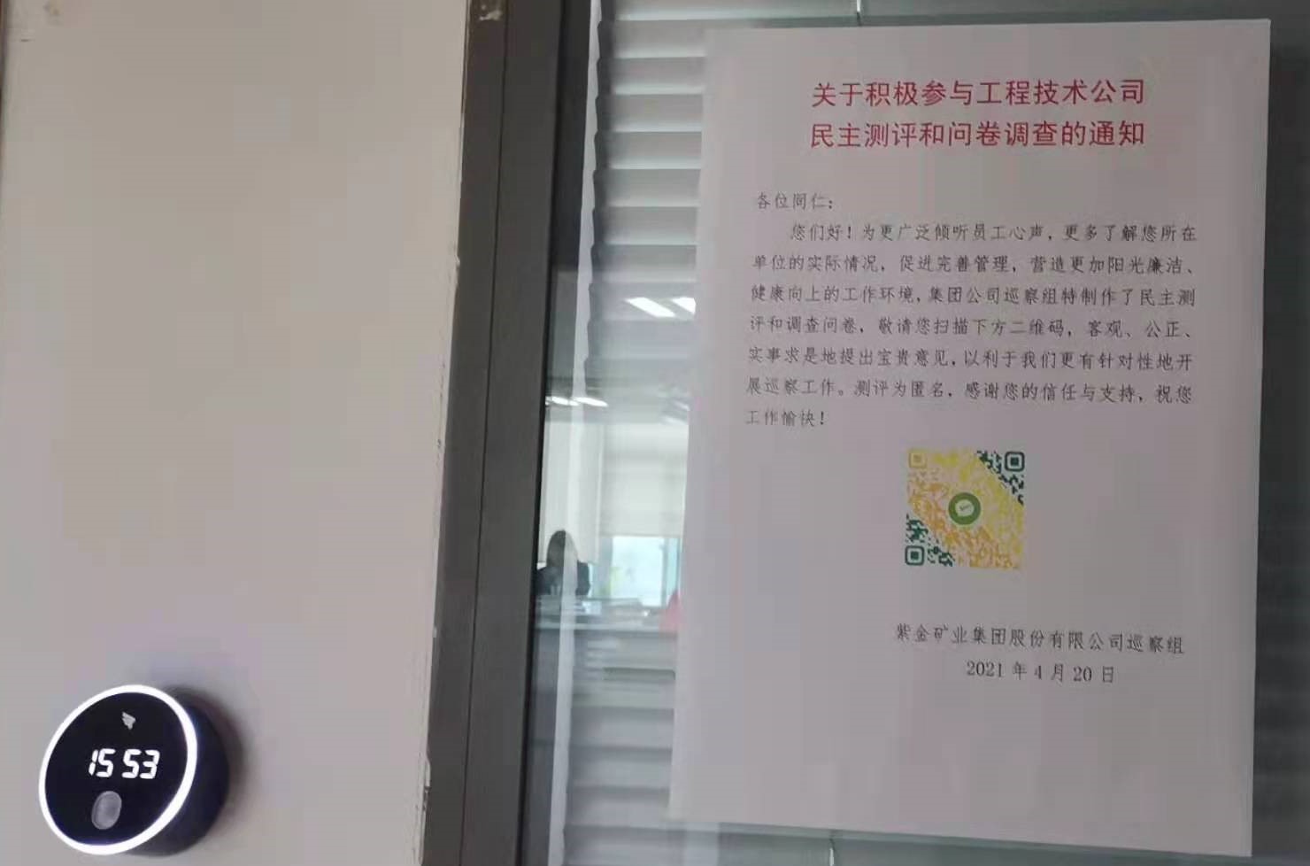 为了更更广泛倾听员工心声及各方情况反映,我们安排了各办公场所、各项目驻地分别在显眼醒目位置张贴巡察公告,并通过各种工作信息平台发布了巡察组制作的微信二维码。此举同时也充分对外展示紫金矿业落实全面从严治党和全面从严治企的优良形象,展现自觉提升ESG责任意识的社会责任担当。